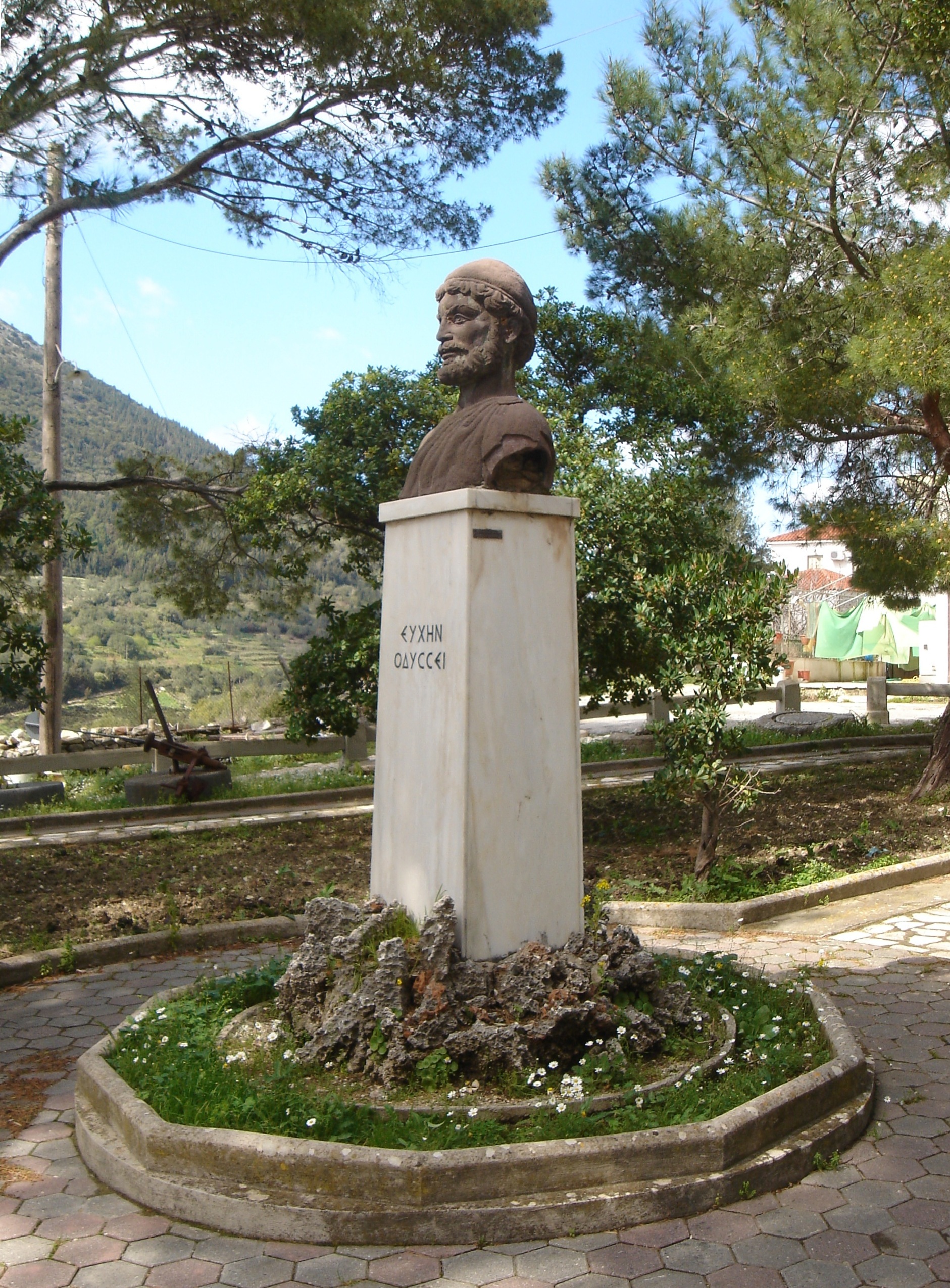 Η προτομή του Οδυσσέα. Βρίσκεται στο κέντρο του πάρκου και είναι στραμμένη προς την θάλασσα. Είναι βασισμένη στην μορφή που εικονίζουν τα χάλκινα νομίσματα της Ιθάκης του 4ου αιώνα π.Χ. και φιλοτεχνήθηκε το 1960 από τον Αθηναίο γλύπτη Γεώργιο Καστριώτη με πρωτοβουλία του Κοινωφελούς Ομίλου Σταυρού. Το 1962 τοποθετήθηκε στο κέντρο του πάρκου, για να γίνει από τότε έμβλημα ολόκληρης της Ιθάκης. Στην βάση της προτομής υπάρχει η επιγραφή ΕΥΧΗΝ ΟΔΥΣΣΕΙ από το ιερό Σπήλαιο της Πόλης.
